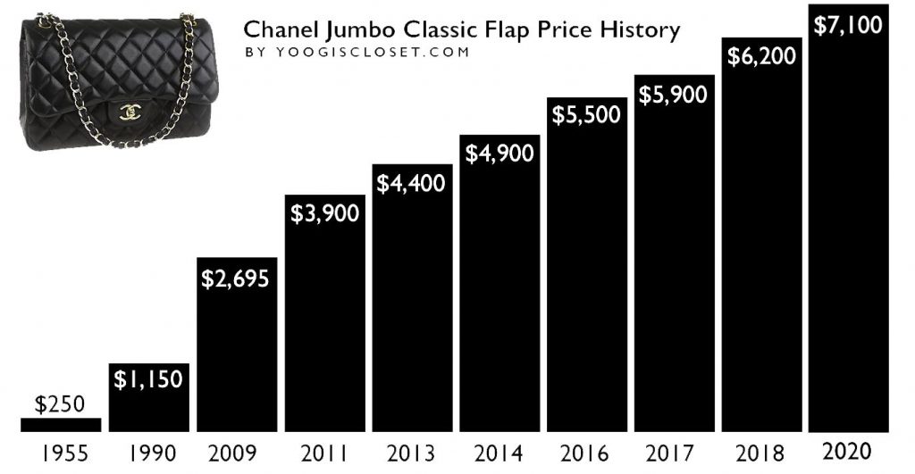 Chanel bags increase in value over time. The original Chanel 2.55 flap bag sold for $220 in February 1955. If you bought a Chanel Caviar Classic Jumbo Flap bag in 2009 for $2695, the price of the same bag is now $6100 (see chart). When the Chanel Medium Boy Bag was introduced in 2011, the price started at $2500. Today, a Medium Boy bag is $5000.